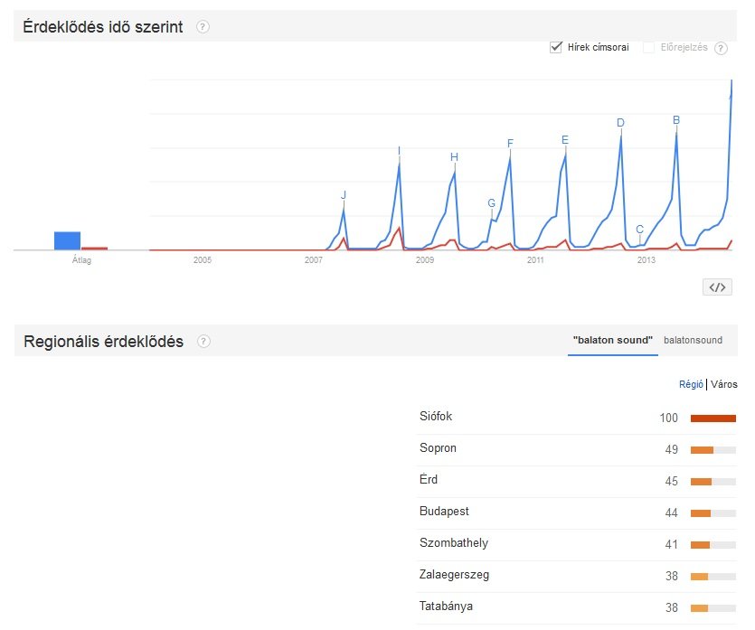 Megnézhetjük például azt, hogy a “fesztivál” kulcsszó és néhány konkrét fesztivál nevének keresettsége az idő függvényében hogyan változott. Általánosságban elmondható, hogy mindegyik esetben nagyon szépen megfigyelhető a szezonális hatás, tehát a nyári időszakban kiugróan magas a keresés a többi hónapokhoz képest. A fesztivál szó keresettsége stabilnak mutatkozik két kirívó évet (2005. és 2011.) leszámítva.Amíg a VOLT Fesztivál Google-ban történő keresettsége folyamatosan és stabilan növekedni látszik, addig az EFOTT és a Balatonsound csökkenő tendenciát mutat. A Balatonsound 2008-ban, míg az EFOTT 2005-ben és 2006-ban tetőzött keresettség tekintetében.